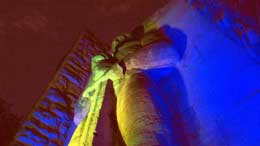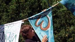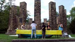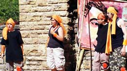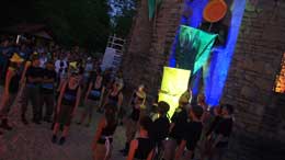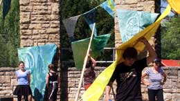 Das goldene Ziel wurde vom Frauenzentrum Weimar verfehlt, weshalb wir es nur kurz in die Druckerschwärze ziehen. Im Heine-Park ragt das martialische Kriegerdenkmal des Rudolstädter Senioren Convents empor. Das nutzten und umspielten zwei Rudolstädter Schülergruppen, "3extra", das Soziokulturelle Zentrum "Saalgärten" und die "Kunstwerkstadt Rudolstadt". "Wallensteins Lager" bot den Hintergrund eines Probenlagers auf der grünen Wiese. Wie da junge und sehr junge Stimmen, zarte Maiden und Rüpelburschen, den Text skandierten, brüllten, sangen und marschtrompeteten war lustig, ergreifend und stimmig.